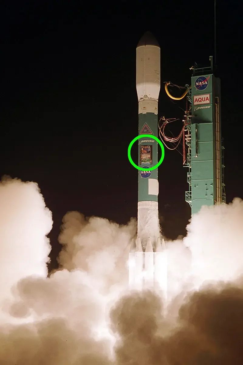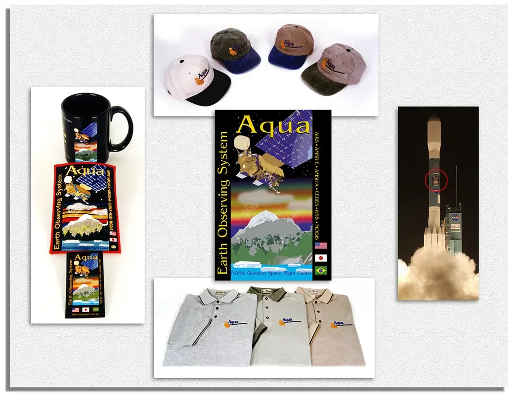 I designed the EOS Aqua emblem, then I provided all of the traditional products for a NASA mission. These included mugs, hats, fabric patches, lapel pins, shirts, decals, and magnets. EOS Aqua was the one time I was able to place one of my emblem designs on an actual launch vehicle. You can see these products above.