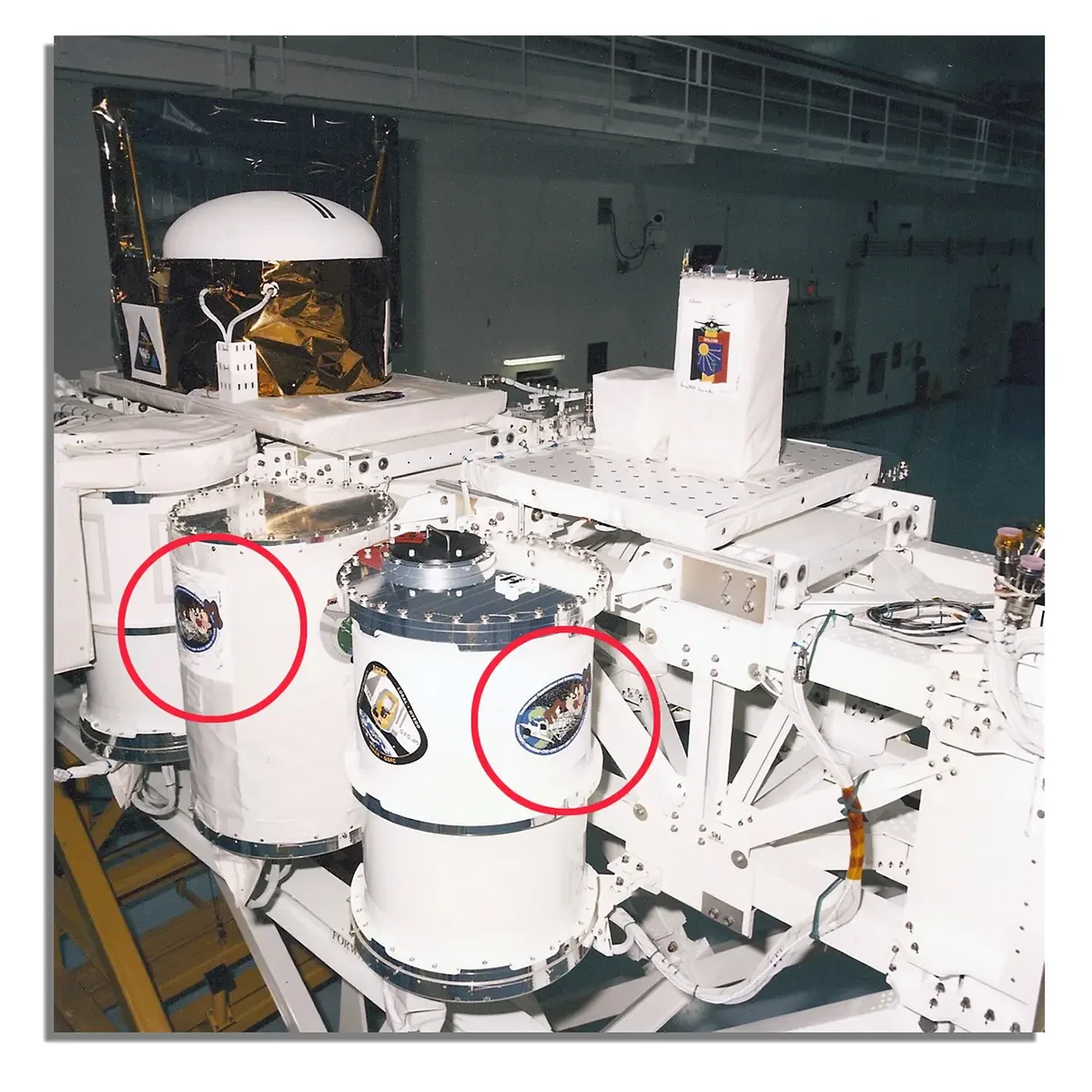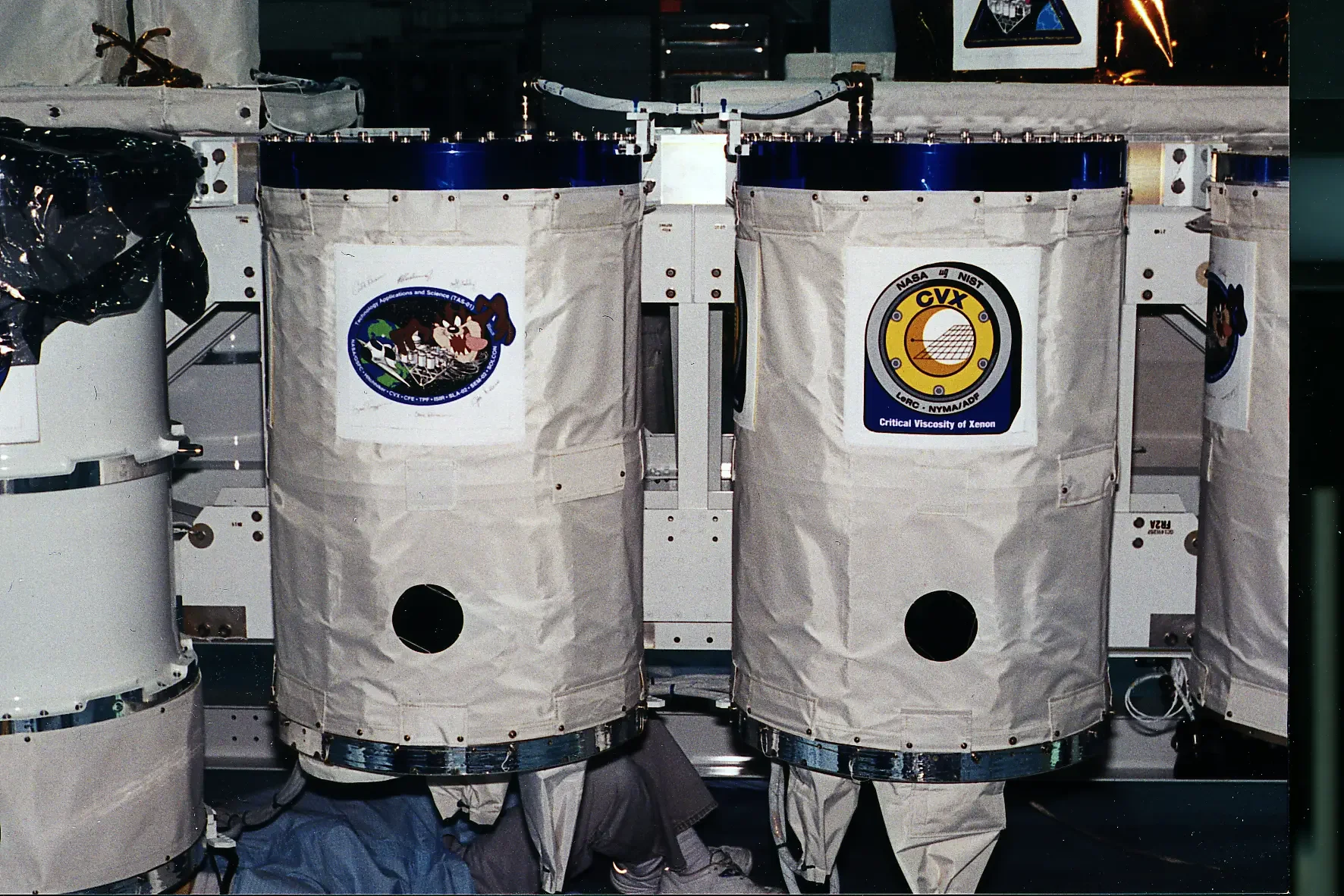 The TAS-01 mission flew on STS-85. After designing the emblem for the mission I had to prepare the art to be expressed on thermal blanket patches, which could withstand the rigors of launch, the vacuum of space, and exposure to solar radiation without the protection of an atmosphere, without presenting any contamination risks to anything else in the Space Shuttle cargo bay. This meant it had to be reverse screen printed on transparent Lexan, using thermal resistant inks. The last layer of ink was white, and sealed all of the other inks in place. Above are the actual patches, in the cargo bay, during mission integration.