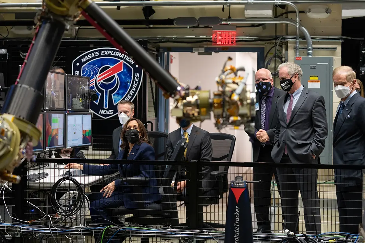 Vice President, Kamala Harris, Goddard Center Director, Dennis Andrucyk, Maryland Sentor, Chris Vanhollen, and NASA Administrator, Bill Nelson pictured in front of one of my emblem designs, as the Vice President pilots a robotic arm in the robotics laboratory at Goddard Space Flight Center.